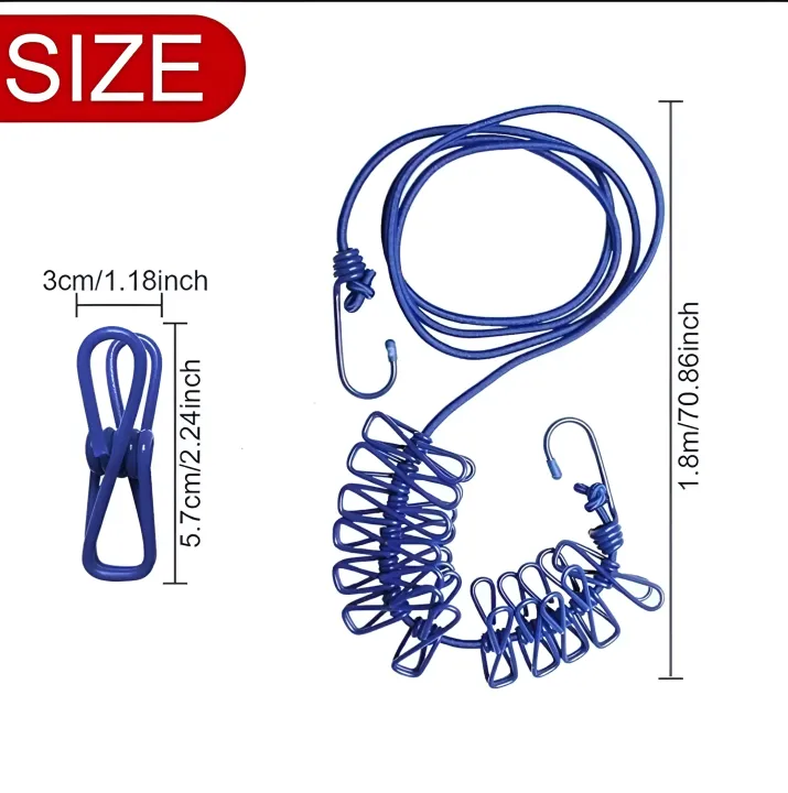 Make your laundry routine easier with this portable clothes drying rope with 12 clips, designed for indoor and outdoor use. This compact drying line is perfect for hanging socks, underwear, baby clothes, and small garments. The strong rope and durable clips securely hold clothes in place, even in windy conditions. It is lightweight, easy to install, and ideal for home, travel, balcony, bathroom, and camping use. Save space while keeping your clothes organized and dry efficiently.