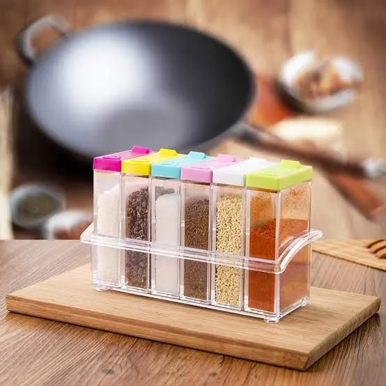 Organize your kitchen neatly with this 6 pcs seasoning spice jar set designed for convenient and stylish storage. This set includes multiple spice containers placed in a crystal-style tray, allowing you to store different spices like salt, pepper, chili, and herbs in one place. The transparent design makes it easy to identify contents quickly while cooking. Each jar comes with a secure lid to keep spices fresh and protected from moisture. Its compact and elegant design not only saves space but also enhances the look of your kitchen countertop.