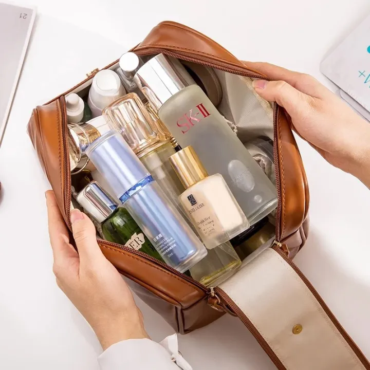 Large leather travel cosmetic makeup bag with waterproof design and spacious storage for makeup, brushes, and beauty essentials. Stylish and portable organizer pouch.